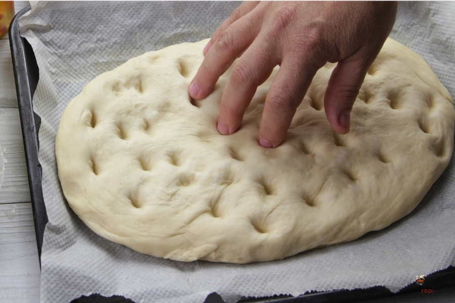 発酵が終わったら、生地を麺棒か手で延ばして平たくします。ここで重要なのが、指で生地に凹みをつける作業です。指を生地に押し込むようにして、表面全体に均等に凹みを作っていきます。この凹みが、フォカッチャの特徴的な見た目と食感を生み出すのです。