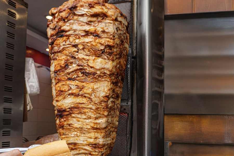 ドネルケバブの調理法は、より複雑です。味付けした肉を垂直の串に上から刺していって積層し、水平に回転させながら縦型グリル(主にガスと電気、以前は炭火が使われていた)の熱で外側から焼きます。焼けた部分から順次、長いナイフで肉を削ぎ落としていくのです。この調理法は、見た目にも迫力があり、屋台の前で立ち止まってしまう理由の一つでもありますね。
