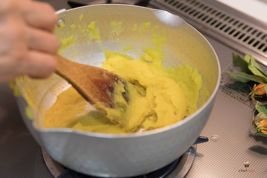 餡を練る際は、焦げ付かないように弱火でじっくりと加熱します。木べらで絶えず混ぜながら、照りが出るまで練り続けることで、美しい黄金色と滑らかな質感が生まれます。