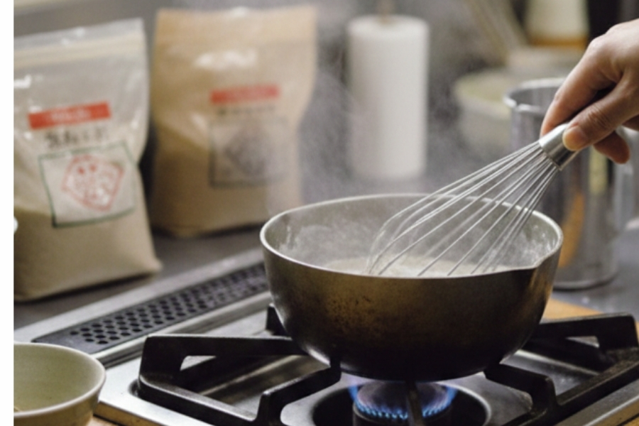 鍋がきは、小鍋に蕎麦粉と水を合わせ、加熱しながら練る方法です。焦げ付かないように絶えず混ぜ続ける必要がありますが、火を通すことで香ばしさが加わります。