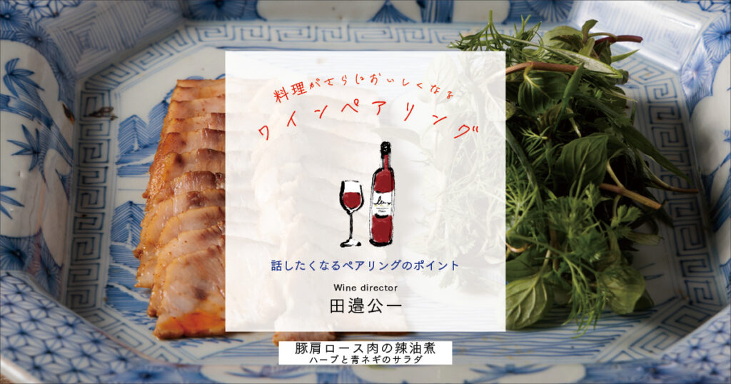 豚肉と辣油を中心に考えた際、南西フランスのバスクに近いエリアで造られるロゼワインを一旦はイメージしたものの、実食の際にハーブのサラダが予想以上に存在感を放っていることに気づき、白ワインへと舵を切ります。