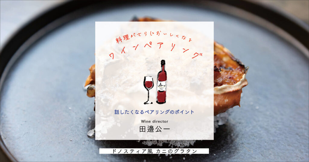 「ドノスティア風 カニのグラタン 」のメニューの名前にある「カニのグラタン」を見た瞬間にまず浮かんできたのは白ワインとのペアリング。ところがレシピと動画を拝見していくと、その考え方を根本的に変える必要があることに気がつきました。