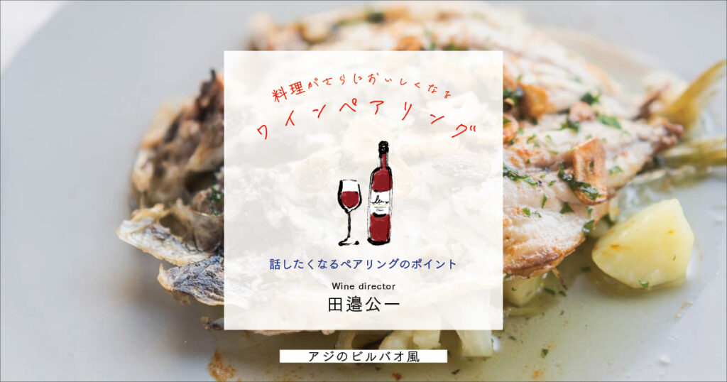 アジをフライパンで両面焼きにしてからオーブンで焼き上げますが、火を入れすぎることなく、香ばしさもありながらふっくらとやわらかく仕上がっています。アジ本来の風味がしっかりと感じられ、食感もソフト。合わせるワインは爽やかさと共にほどよいコクとまろやかさがあることを意識します。